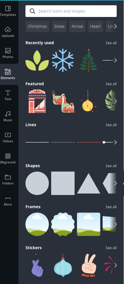 Now I want to add an element to my logo. Click on “Elements” under the “Photos” icon. Search for the type of element you have in mind in the search bar or simply browse the different options. Look how cute that blue snowflake is? They even have animated elements.